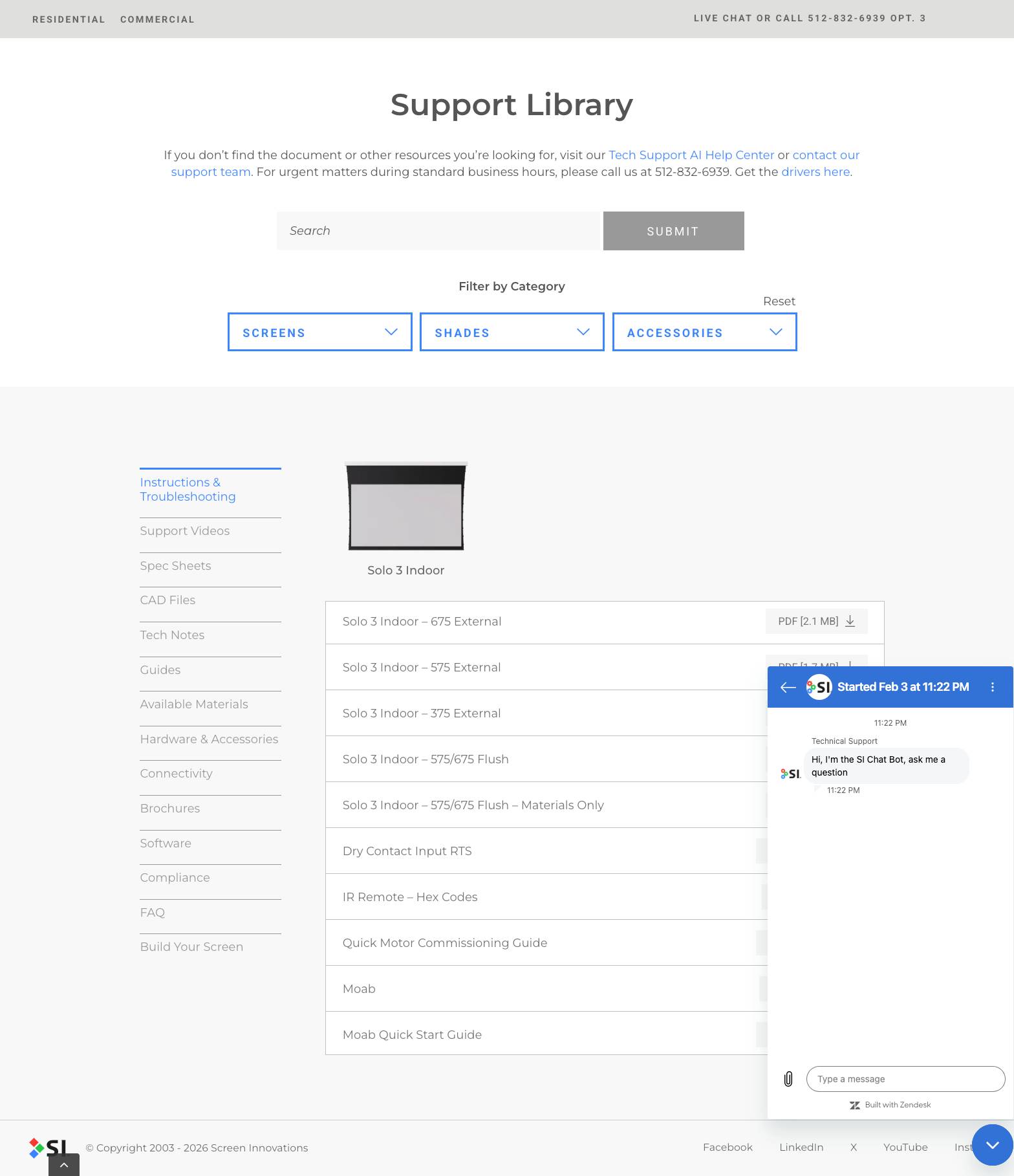 Built a centralized support platform for Screen Innovations housing instructional guides, spec sheets, how-to videos, and technical resources across screens, shades, materials, and accessories. Implemented Zendesk live chat and an AI chatbot used by the in-house support team to reduce live support calls, improve response times, and increase productivity—while making critical information more accessible to installers in the field.
