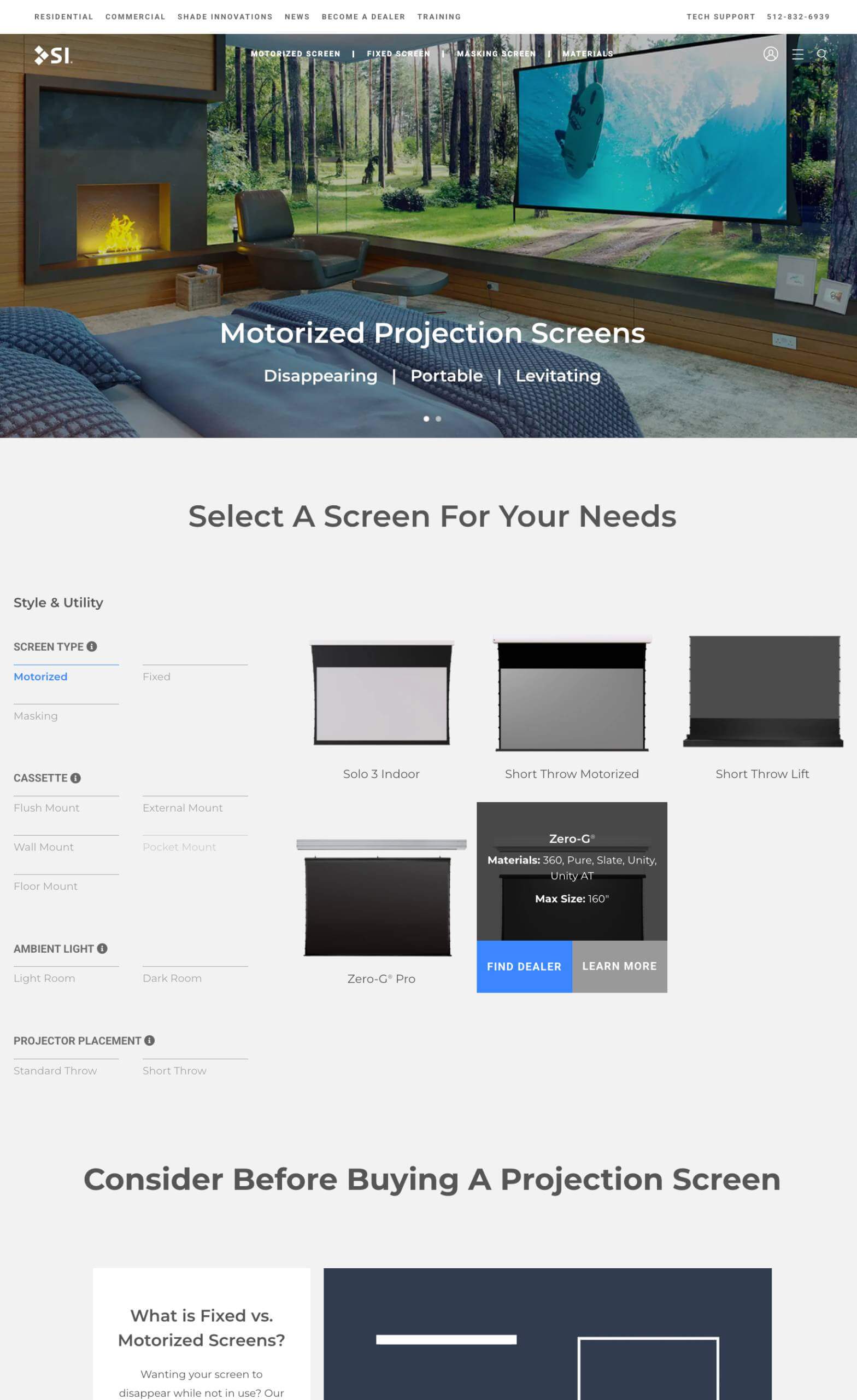 A custom-built product filtering tool designed to help customers quickly find the right projection screen based on key criteria such as screen form, mounting style, room lighting conditions, and projector type. The WordPress theme was extensively customized to surface critical screen specifications directly within the filtering experience, allowing users to compare options without friction.