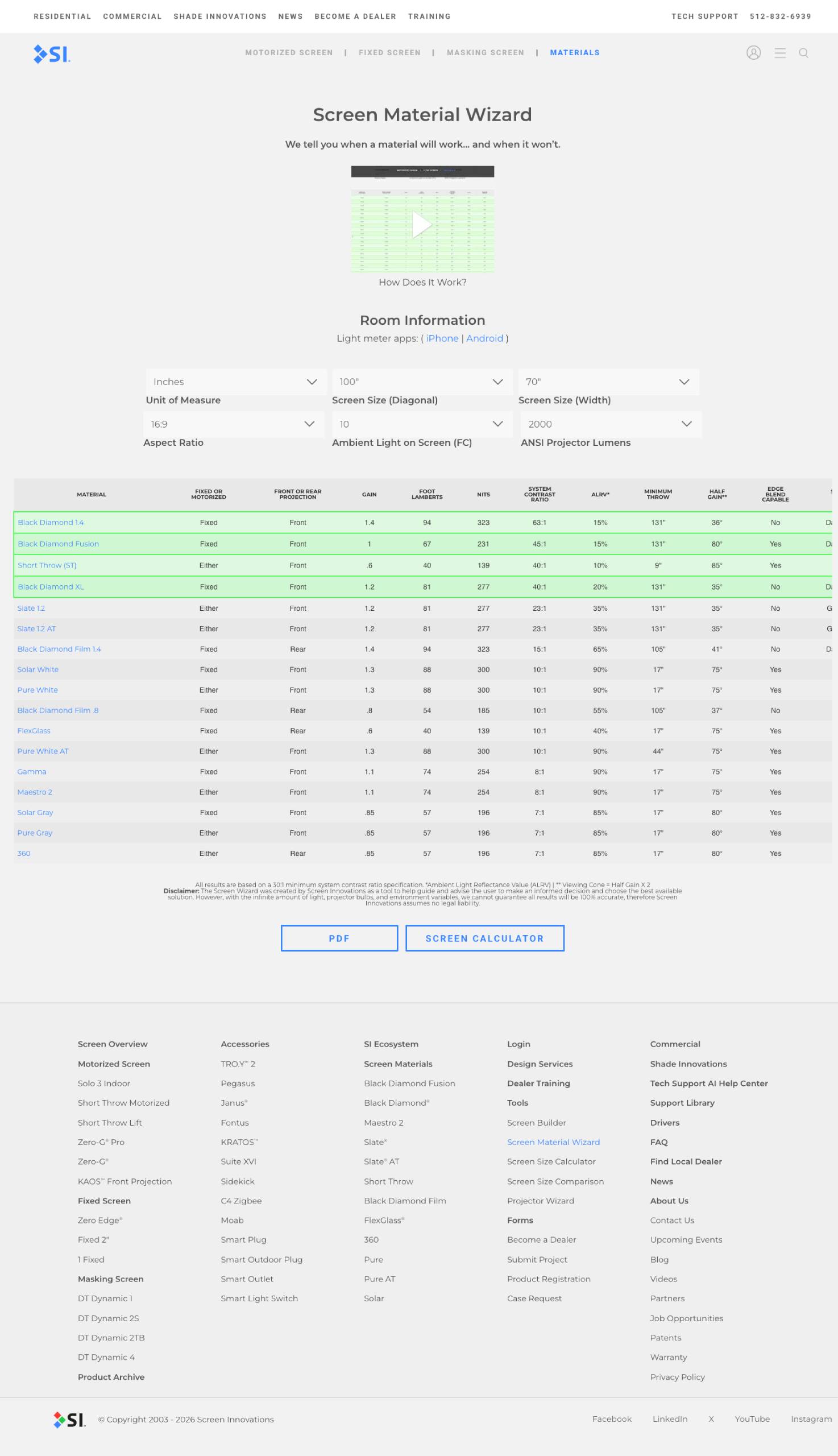 An interactive product-selection tool designed to guide customers and sales teams to the optimal projection screen material based on real-world viewing conditions. The wizard walks users through key variables such as room lighting, projector brightness, screen size, and viewing environment, then dynamically recommends compatible screen materials and performance characteristics. Custom database development was used to surface complex product data in an intuitive, decision-driven experience that simplifies a traditionally technical buying process.
